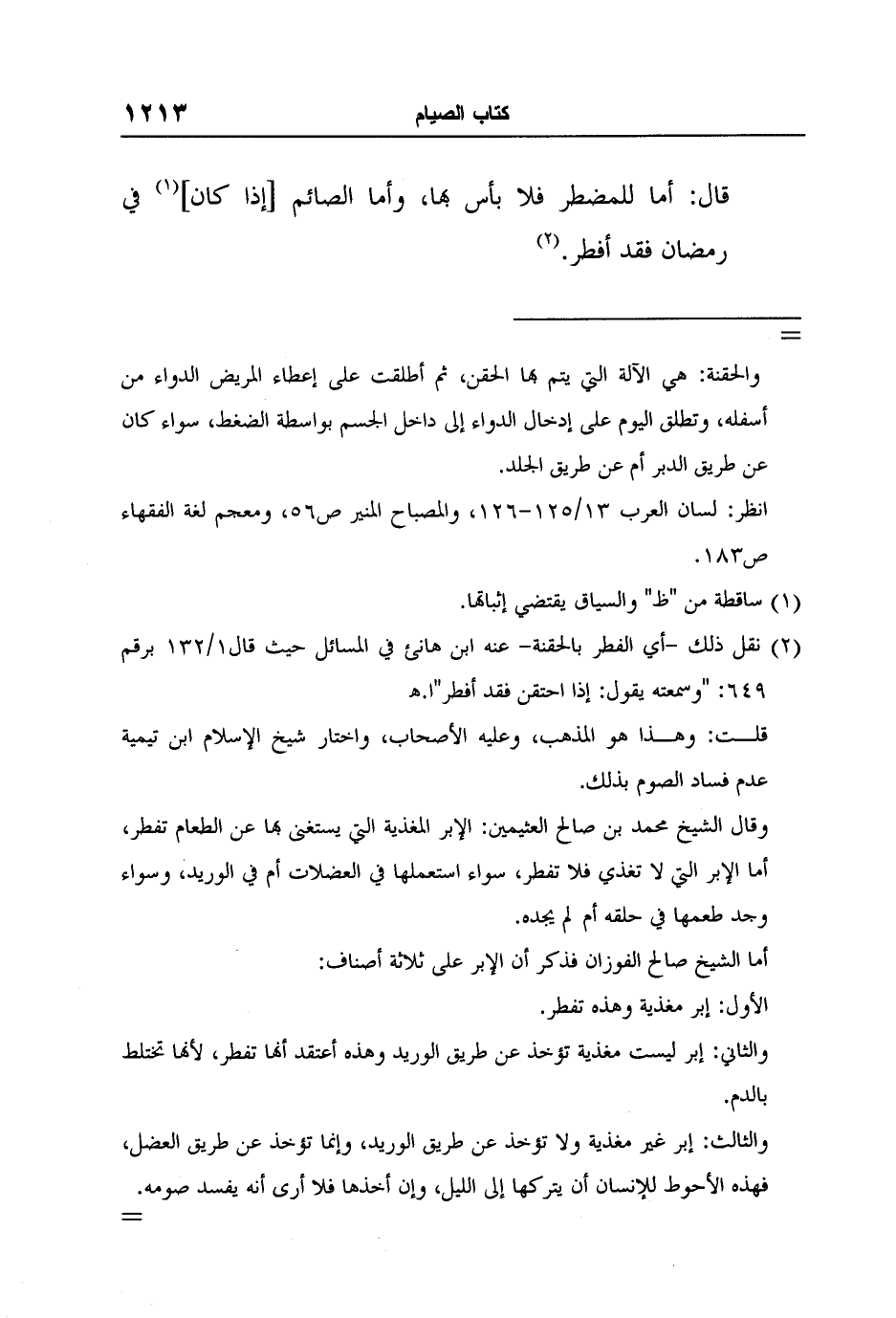 وقال الشيخ محمد بن صالح العثيمين: الإبر المغذية التي يستغنى بها عن الطعام تفطر، أما الإبر التي لا تغذي فلا تفطر، سواء استعملها في العضلات أم في الوريد، وسواء وجد طعمها في حلقه أم لم يجده.