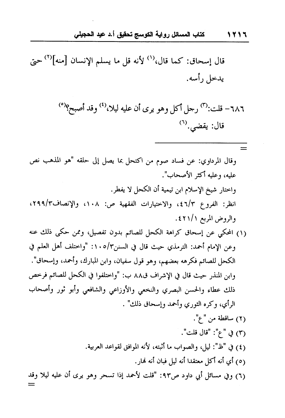 1 المحكي عن إسحاق كراهة الكحل للصائم بدون تفصيل، وممن حكى ذلك عنه وعن الإمام أحمد: الترمذي حيث قال في السنن3/105: "واختلف أهل العلم في الكحل للصائم فكرهه بعضهم، وهو قول سفيان، وابن المبارك، وأحمد، وإسحاق".