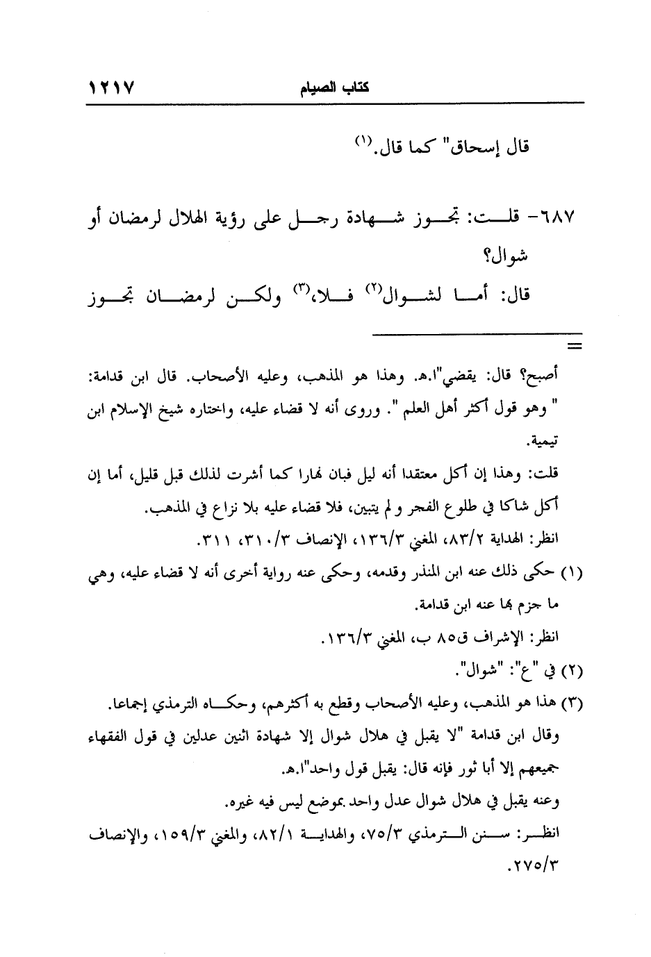 [687-] قلت: تجوز شهادة رجل على رؤية الهلال لرمضان أو شوال؟