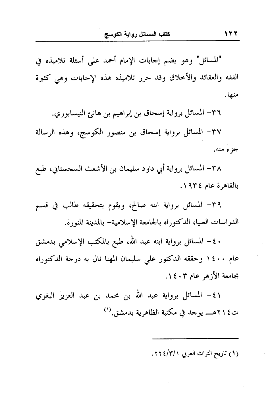 38- المسائل برواية أبي داود سليمان بن الأشعث السجستاني، طبع بالقاهرة عام 1934.