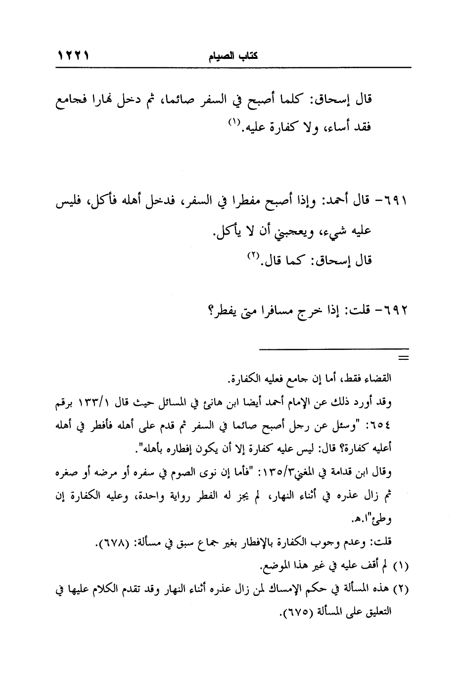 2 هذه المسألة في حكم الإمساك لمن زال عذره أثناء النهار وقد تقدم الكلام عليها في التعليق على المسألة (675) .
