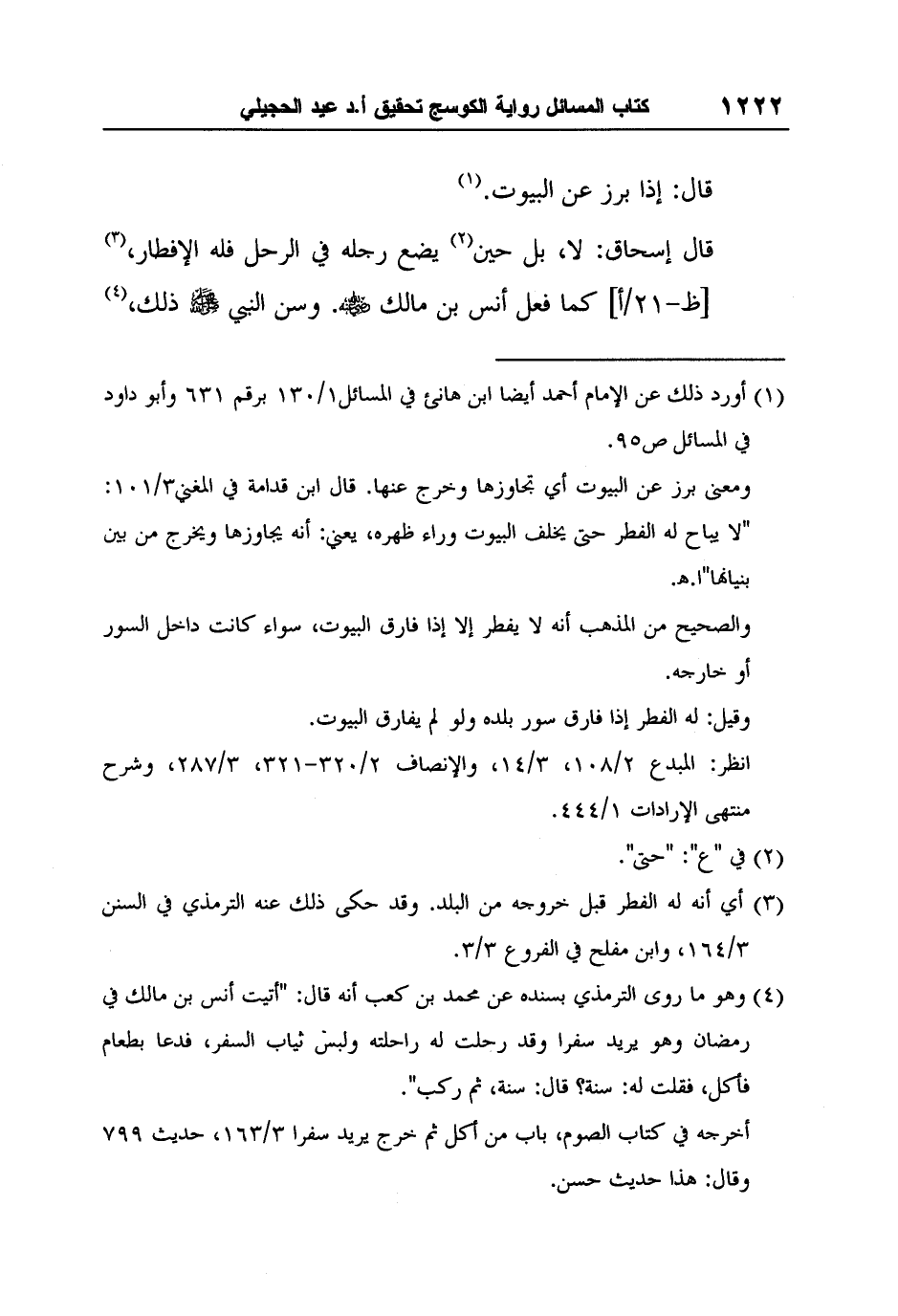 4 وهو ما روى الترمذي بسنده عن محمد بن كعب أنه قال: "أتيت أنس بن مالك في رمضان وهو يريد سفراً وقد رحلت له راحلته ولبس ثياب السفر، فدعا بطعام فأكل، فقلت له: سنة؟ قال: سنة، ثم ركب".