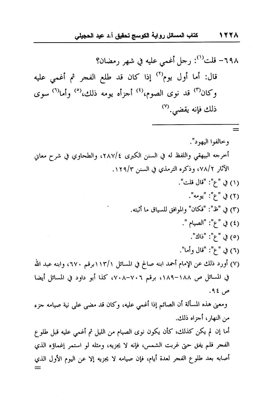 [7] أورد ذلك عن الإمام أحمد ابنه صالح في المسائل 1/113برقم 670، وابنه عبد الله في المسائل ص 188-[189،] برقم 706-708، كذا أبو داود في المسائل أيضاً ص 94.