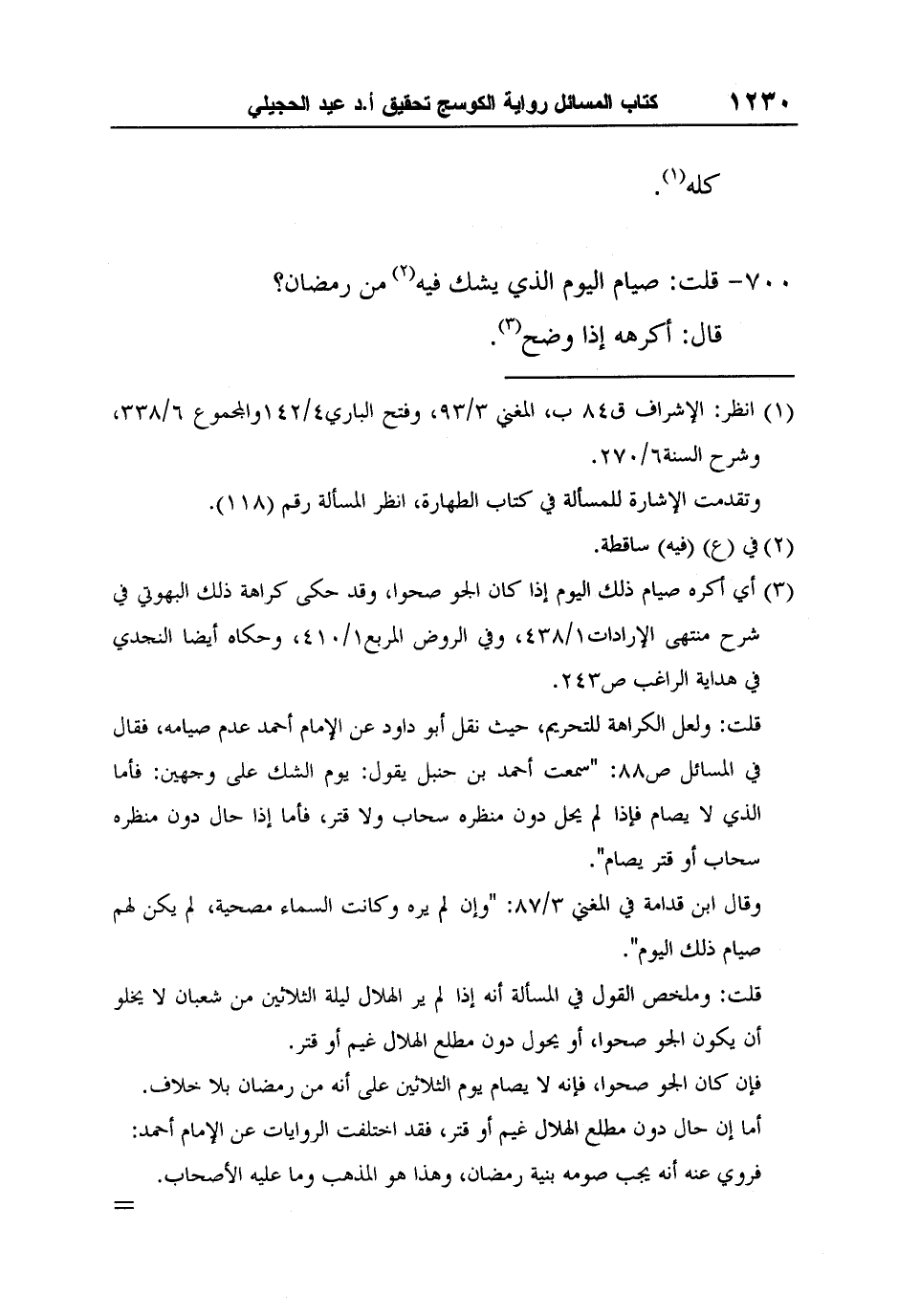 قلت: ولعل الكراهة للتحريم، حيث نقل أبو داود عن الإمام أحمد عدم صيامه، فقال في المسائل ص88: "سمعت أحمد بن حنبل يقول: يوم الشك على وجهين: فأما الذي لا يصام فإذا لم يحل دون منظره سحاب ولا قتر، فأما إذا حال دون منظره سحاب أو قتر يصام".