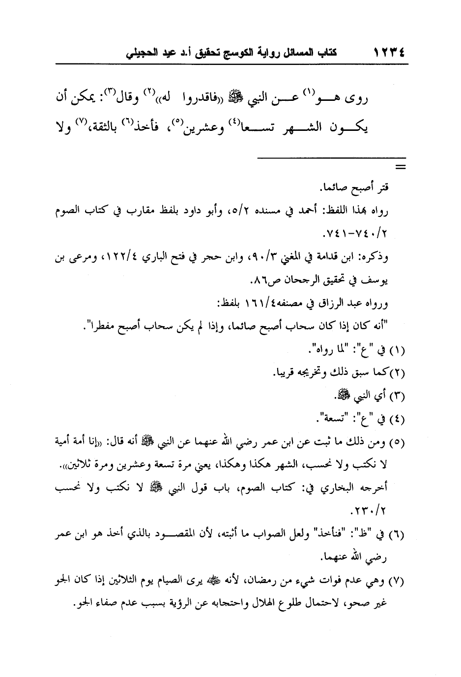 5 ومن ذلك ما ثبت عن ابن عمر رضي الله عنهما عن النبي صلى الله عليه وسلم أنه قال: "إنا أمة أمية لا نكتب ولا نحسب، الشهر هكذا وهكذا، يعني مرة تسعة وعشرين ومرة ثلاثين".