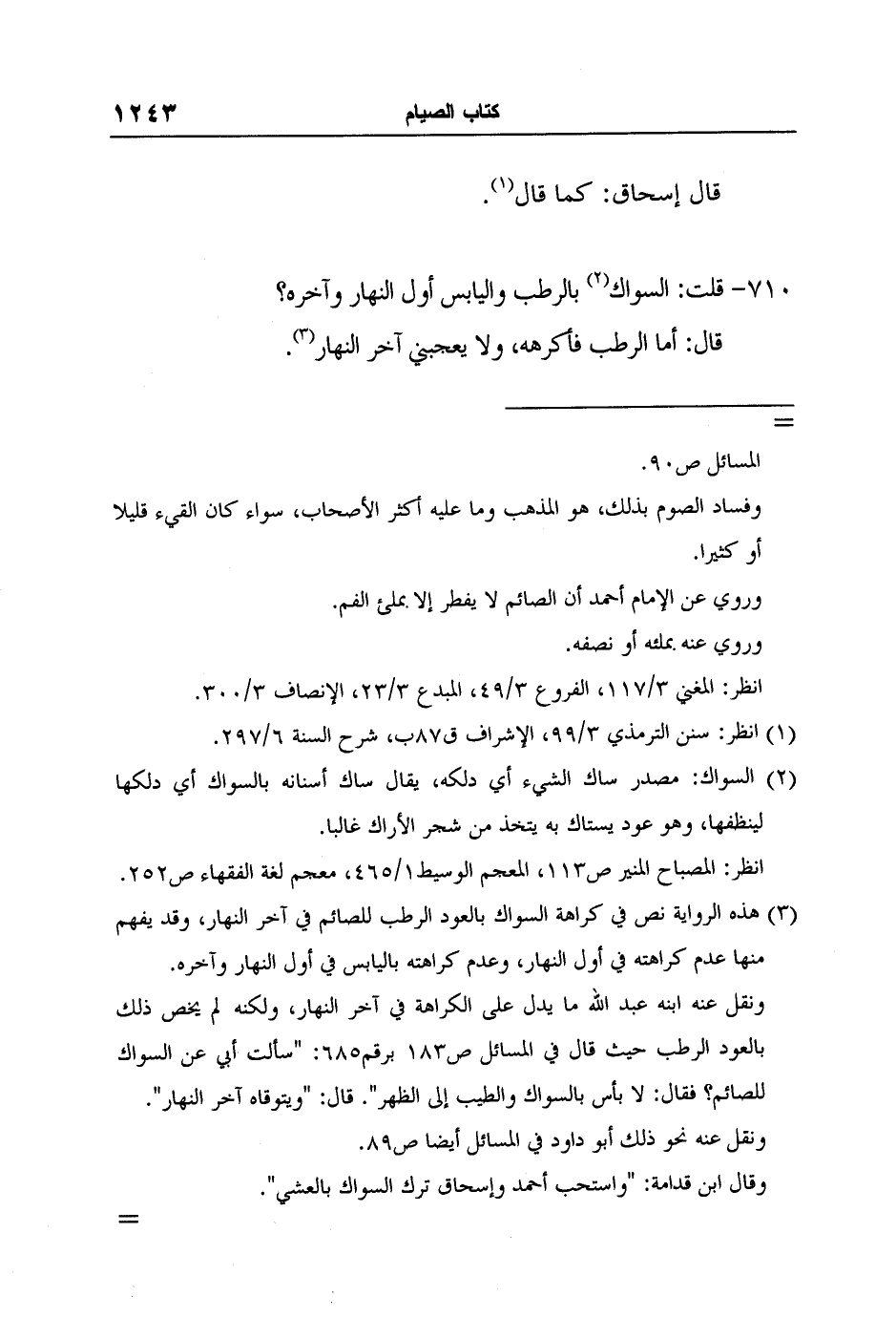 [710-] قلت: السواك2 بالرطب واليابس أول النهار وآخره؟