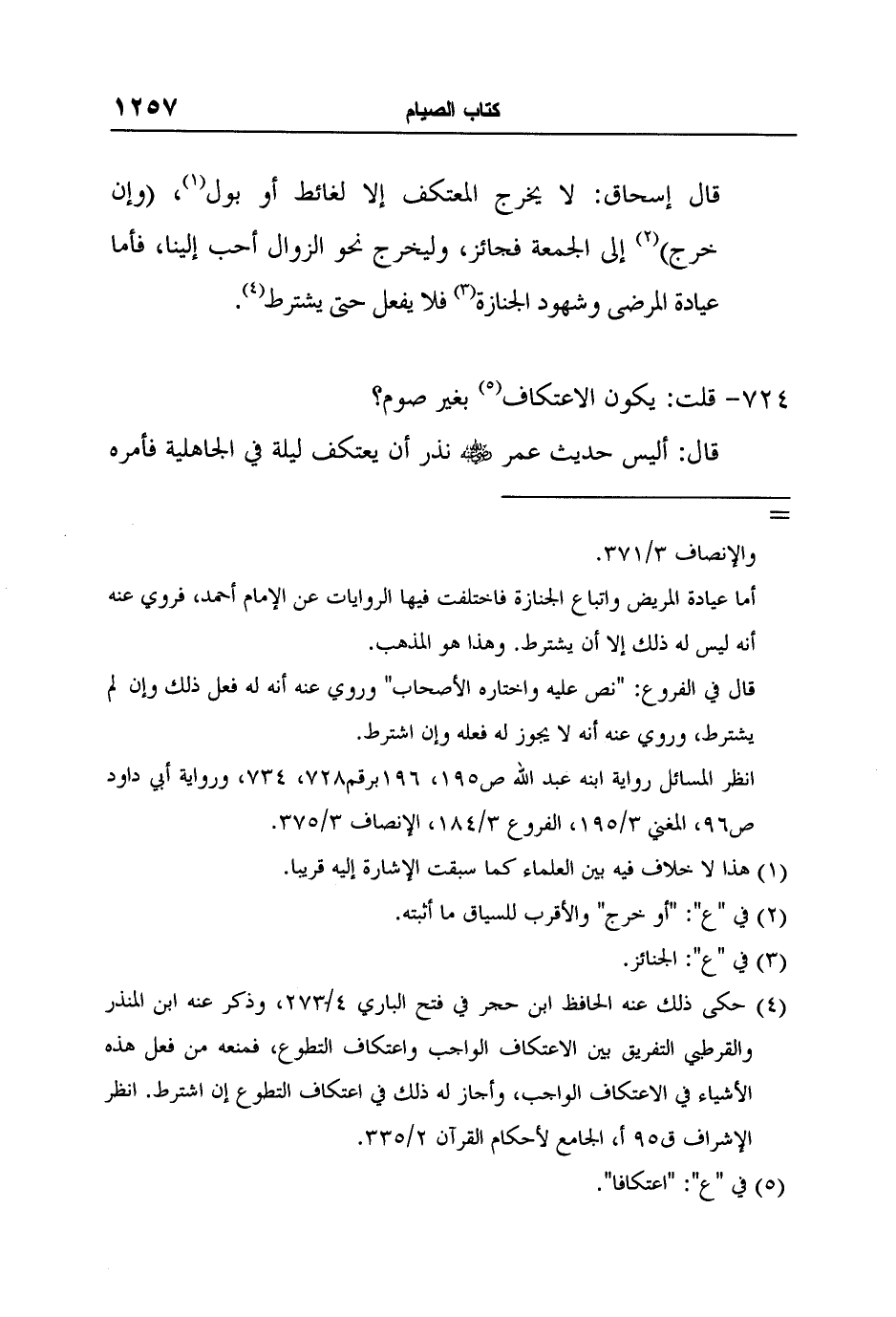 قال إسحاق: لا يخرج المعتكف إلا لغائط أو بول1، (وإن خرج) 2 إلى الجمعة فجائز، وليخرج نحو الزوال أحب إلينا، فأما عيادة المرضى وشهود الجنازة3 فلا يفعل حتى يشترط4.