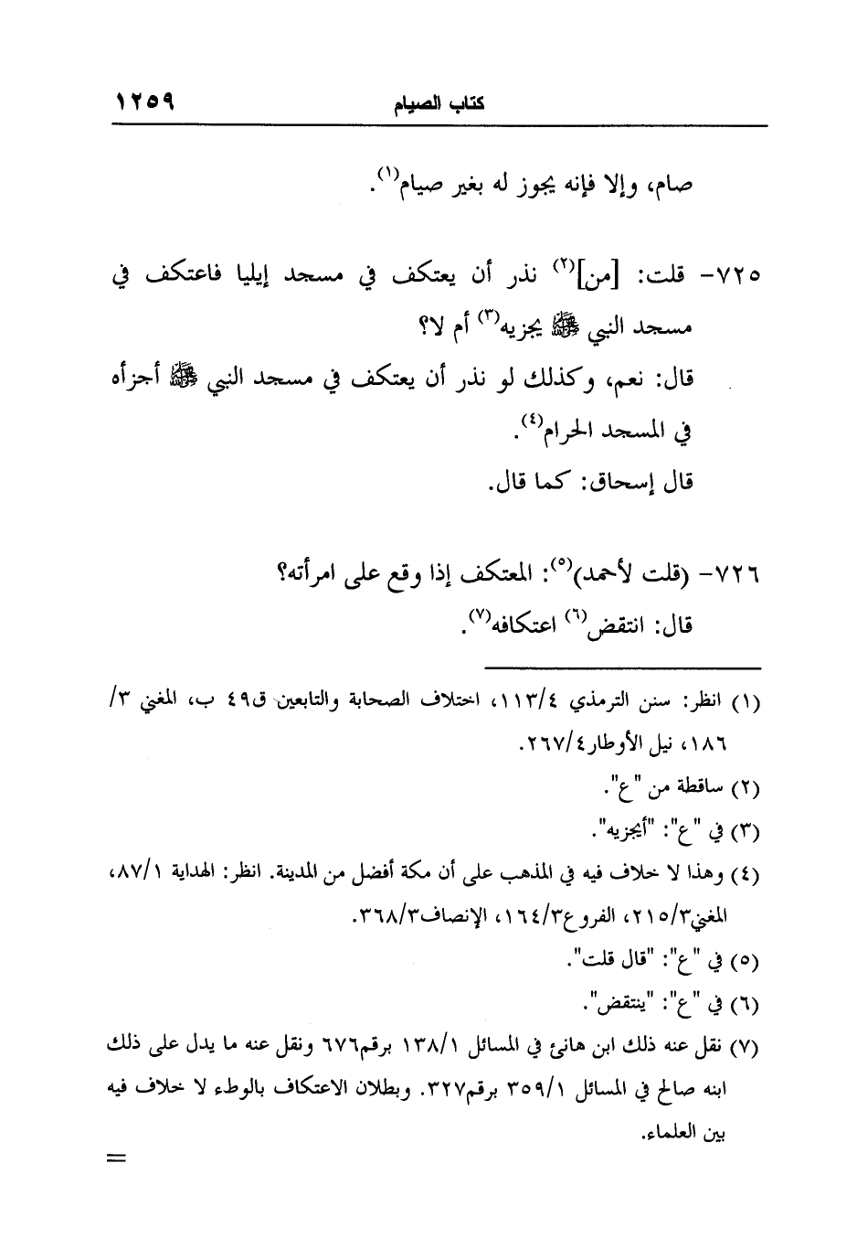 7 نقل عنه ذلك ابن هانئ في المسائل 1/138 برقم676 ونقل عنه ما يدل على ذلك ابنه صالح في المسائل 1/359 برقم327. وبطلان الاعتكاف بالوطء لا خلاف فيه بين العلماء.