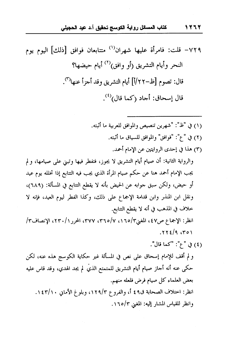 والرواية الثانية: أن صيام أيام التشريق لا يجوز، فتفطر فيها وتبني على صيامها، ولم يجب الإمام أحمد هنا عن حكم صيام المرأة الذي يجب فيه التتابع إذا تخلله يوم عيد أو حيض، ولكن سبق جوابه عن الحيض بأنه لا يقطع التتابع في المسألة: (689) ، ونقل ابن المنذر وابن قدامة الإجماع على ذلك، وكذا الفطر ليوم العيد، فإنه لا خلاف في المذهب في أنه لا يقطع التتابع.