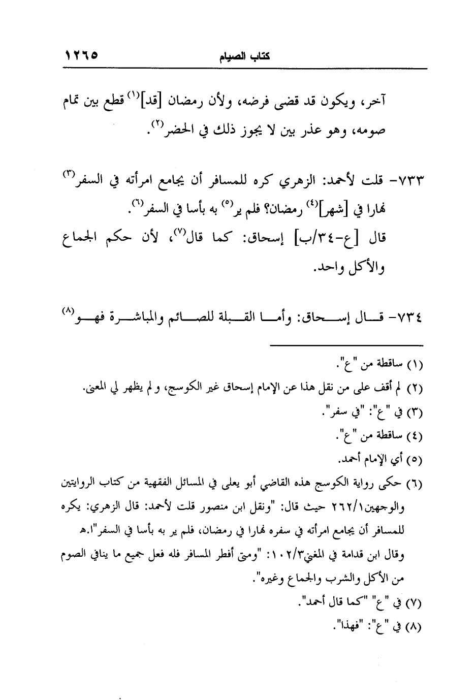 [733-] قلت لأحمد: الزهري كره للمسافر أن يجامع امرأته في السفر3 نهاراً في [شهر] 4 رمضان؟ فلم ير5 به بأساً في السفر6.
