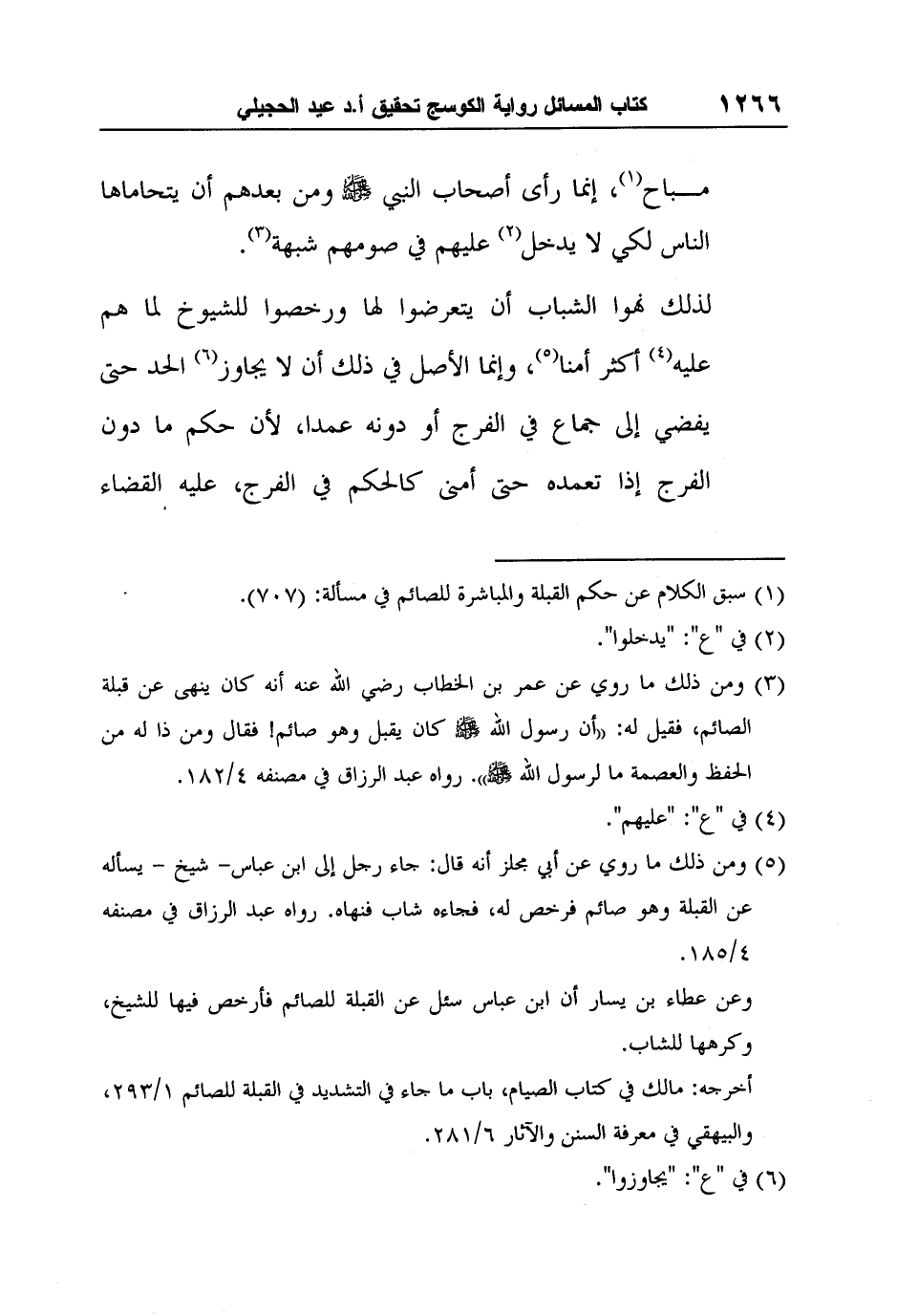 5 ومن ذلك ما روي عن أبي مجلز أنه قال: جاء رجل إلى ابن عباس- شيخ - يسأله عن القُبلة وهو صائم فرخص له، فجاءه شاب فنهاه. رواه عبد الرزاق في مصنفه 4/185.