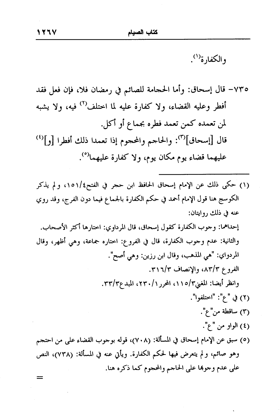 5 سبق عن الإمام إسحاق في المسألة: (708) ، قوله بوجوب القضاء على من احتجم وهو صائم، ولم يتعرض فيها لحكم الكفارة. ويأتي عنه في المسألة: (738) ، النص على عدم وجوبها على الحاجم والمحجوم كما ذكره هنا.