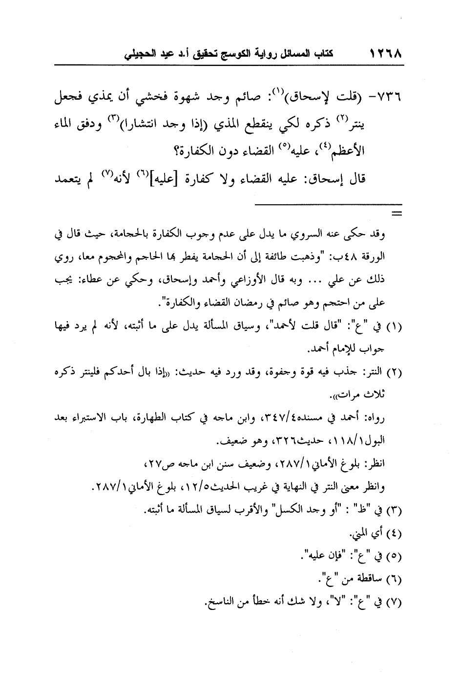 [736-] (قلت لإسحاق) 1: صائم وجد شهوة فخشي أن يمذي فجعل ينتر2 ذكره لكي ينقطع المذي (إذا وجد انتشاراً) 3 ودفق الماء الأعظم4، عليه5 القضاء دون الكفارة؟