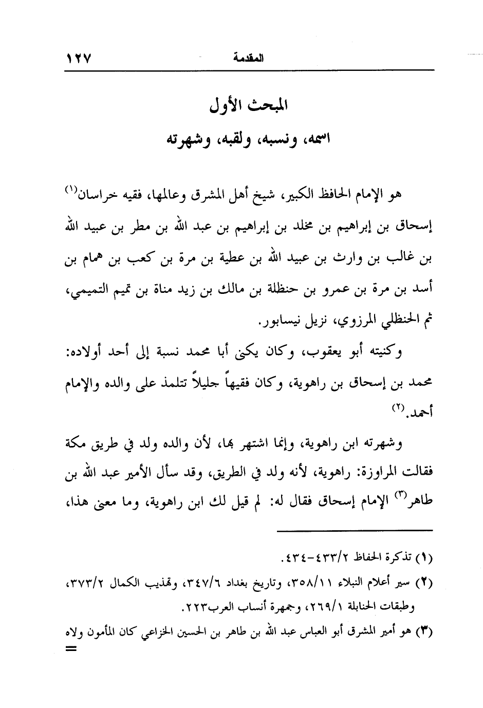 هو الإمام الحافظ الكبير، شيخ أهل المشرق وعالمها، فقيه خراسان1 إسحاق بن إبراهيم بن مخلد بن إبراهيم بن عبد الله بن مطر بن عبيد الله بن غالب بن وارث بن عبيد الله بن عطية بن مرة بن كعب بن همام بن أسد بن مرة بن عمرو بن حنظلة بن مالك بن زيد مناة بن تميم التميمي، ثم الحنظلي المرزوي، نزيل نيسابور.