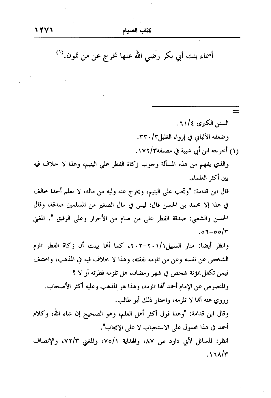وانظر أيضاً: منار السبيل1/201-202، كما أنها بينت أن زكاة الفطر تلزم الشخص عن نفسه وعن من تلزمه نفقته، وهذا لا خلاف فيه في المذهب، واختلف فيمن تكفل بمؤنة شخص في شهر رمضان، هل تلزمه فطرته أو لا؟