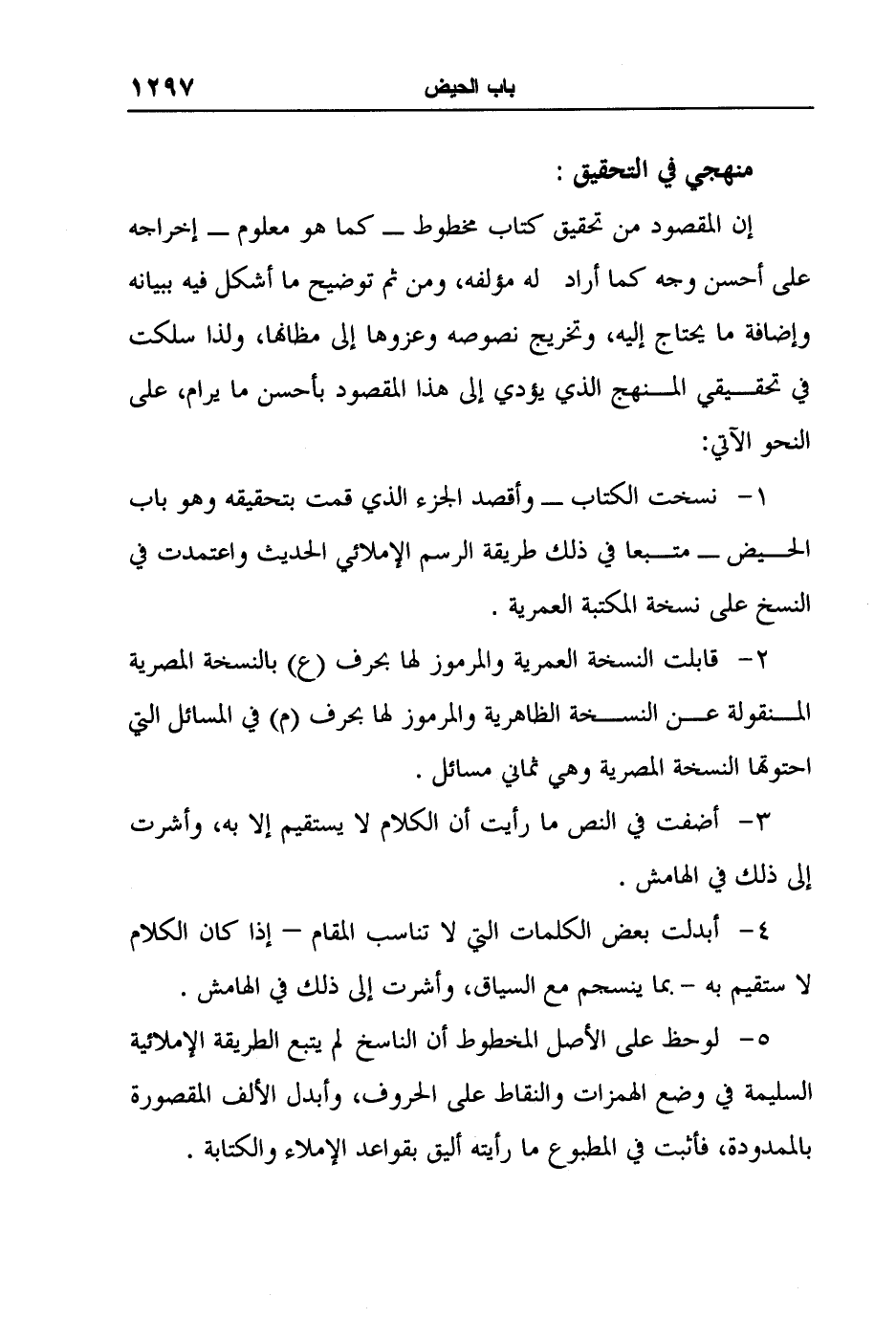 1- نسخت الكتاب ـ وأقصد الجزء الذي قمت بتحقيقه وهو باب الحيض ـ متبعاً في ذلك طريقة الرسم الإملائي الحديث واعتمدت في النسخ على نسخة المكتبة العمرية.