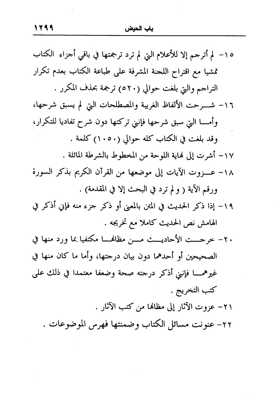 19- إذا ذكر الحديث في المتن بالمعنى أو ذكر جزء منه فإني أذكر في الهامش نص الحديث كاملا مع تخريجه.