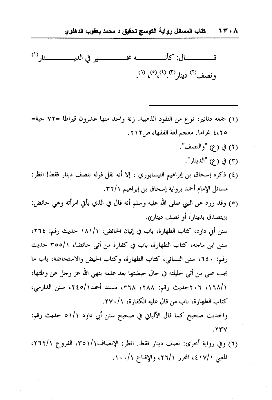 4 ذكره إسحاق بن إبراهيم النيسابوري، إلاّ أنّه نقل قوله بنصف دينار فقط! انظر: مسائل الإمام أحمد برواية إسحاق بن إبراهيم 1/32.
