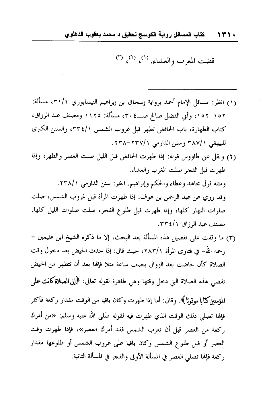 [1] انظر: مسائل الإمام أحمد برواية إسحاق بن إبراهيم النيسابوري 1/31، مسألة: 152-152، وأبي الفضل صالح صـ304، مسألة: 1125 ومصنف عبد الرزّاق، كتاب الطهارة، باب الحائض تطهر قبل غروب الشمس 1/334، والسنن الكبرى للبيهقي 1/387 وسنن الدارمي 1/237-238.