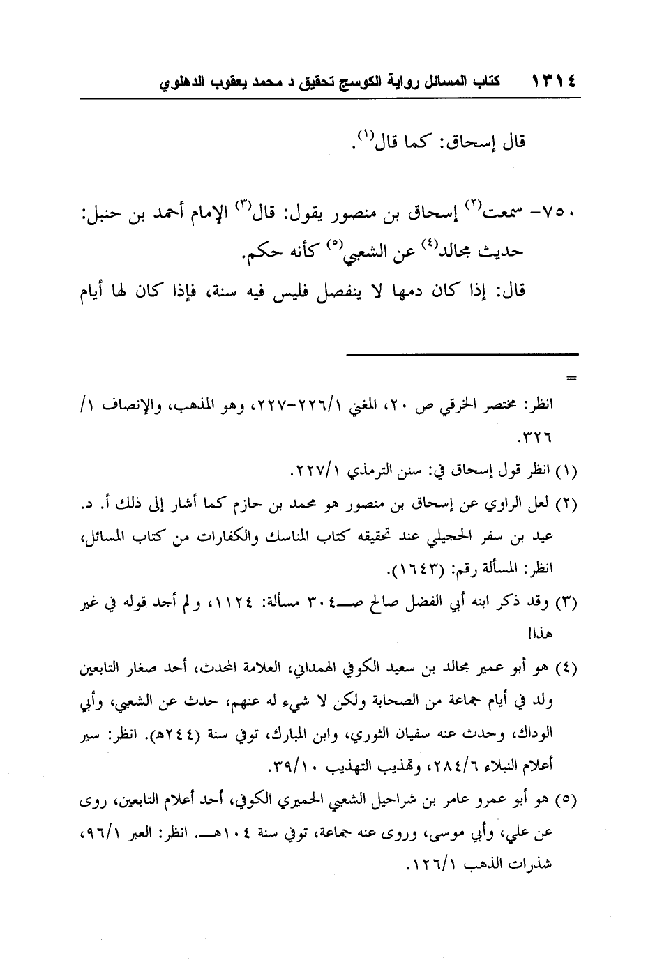[750-] سمعت2 إسحاق بن منصور يقول: قال3 الإمام أحمد بن حنبل: حديث مجالد4 عن الشعبي5 كأنه حكم.