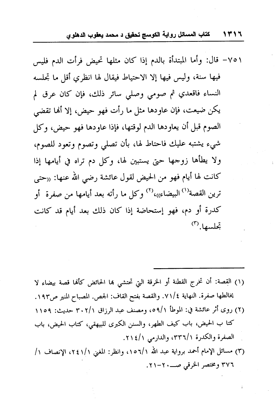 2 روى أثر عائشة في: الموطأ 1/59، ومصنّف عبد الرزّاق 1/302 حديث: 1159كتا ب الحيض، باب كيف الطهر، والسنن الكبرى للبيهقي، كتاب الحيض، باب الصفرة والكدرة 1/336، والدارمي 1/214.