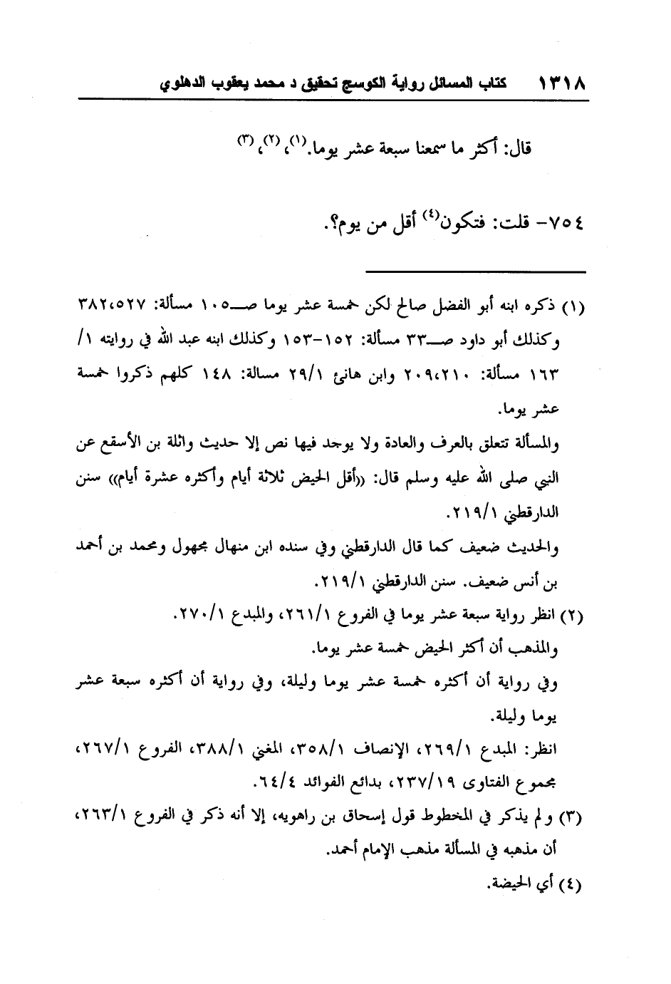 والمسألة تتعلق بالعرف والعادة ولا يوجد فيها نصّ إلاّ حديث واثلة بن الأسقع عن النبيّ صلّى الله عليه وسلّم قال: "أقلّ الحيض ثلاثة أيّام وأكثره عشرة أيّام" سنن الدارقطني 1/219.