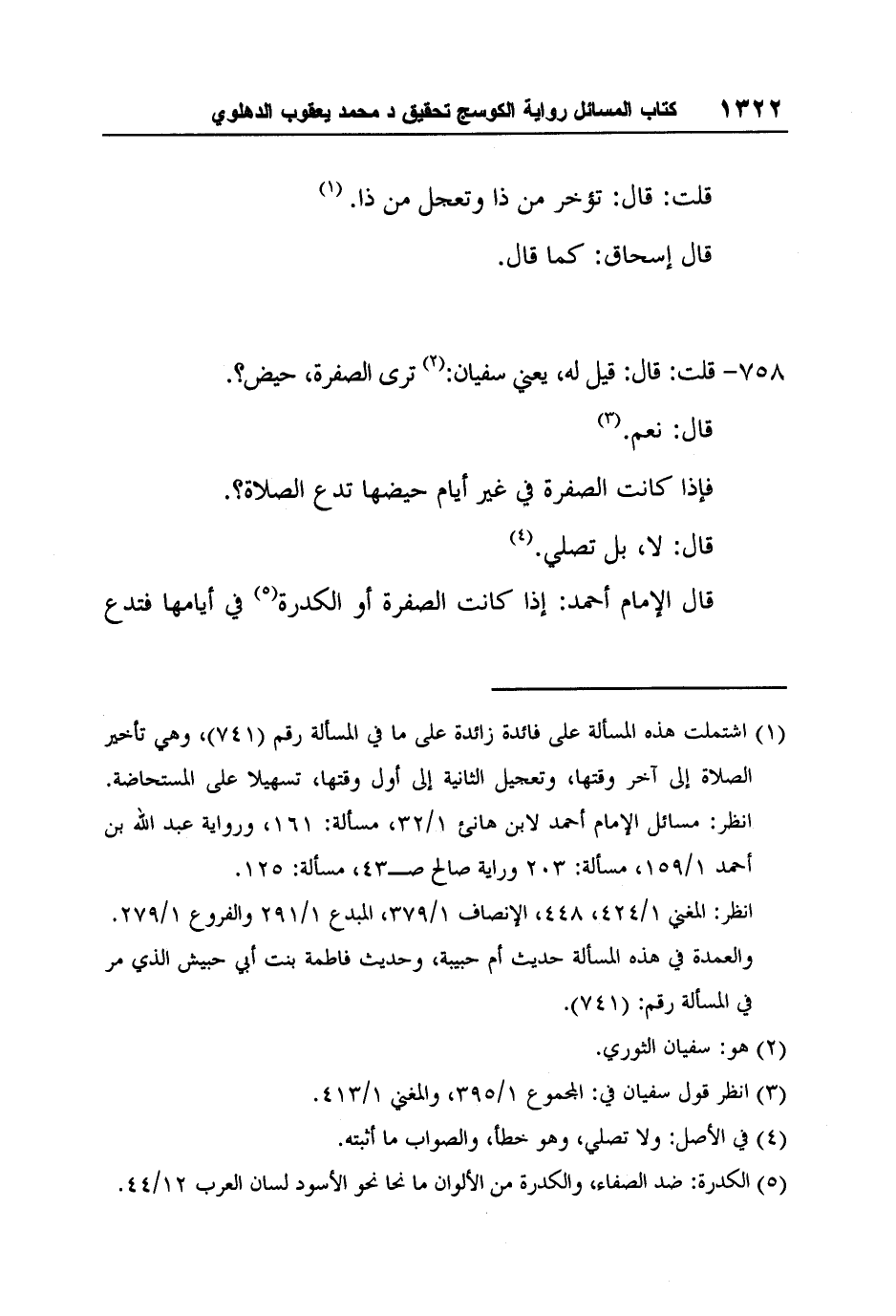 [758-] قلت: قال: قيل له، يعني سفيان:2 ترى الصفرة، حيض؟.