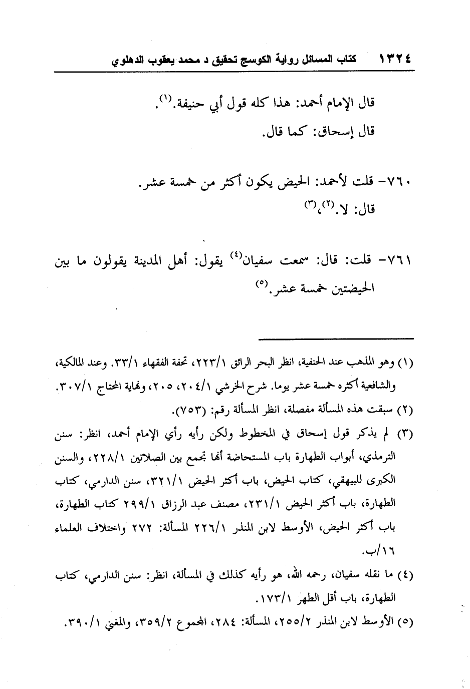 3 لم يذكر قول إسحاق في المخطوط ولكن رأيه رأي الإمام أحمد، انظر: سنن الترمذي، أبواب الطهارة باب المستحاضة أنها تجمع بين الصلاتين 1/228، والسنن الكبرى للبيهقي، كتاب الحيض، باب أكثر الحيض 1/321، سنن الدارمي، كتاب الطهارة، باب أكثر الحيض 1/231، مصنف عبد الرزّاق 1/299 كتاب الطهارة، باب أكثر الحيض، الأوسط لابن المنذر 1/226 المسألة: 272 واختلاف العلماء 16/ب.