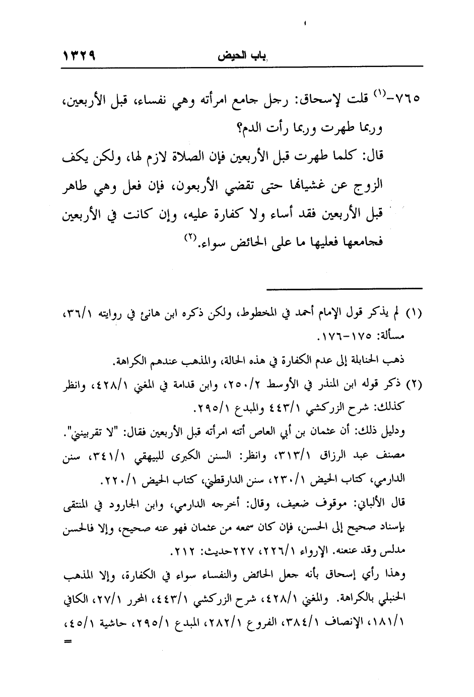 [765-] 1 قلت لإسحاق: رجل جامع امرأته وهي نفساء، قبل الأربعين، وربما طهرت وربما رأت الدم؟