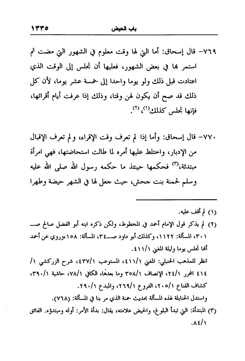 2 لم يذكر قول الإمام أحمد في المخطوط، ولكن ذكره ابنه أبو الفضل صالح صـ301، المسألة: 1122، وكذلك أبو داود صـ34، المسألة: 158،وروي عن أحمد أنها تجلس يوما وليلة المغني 1/411.