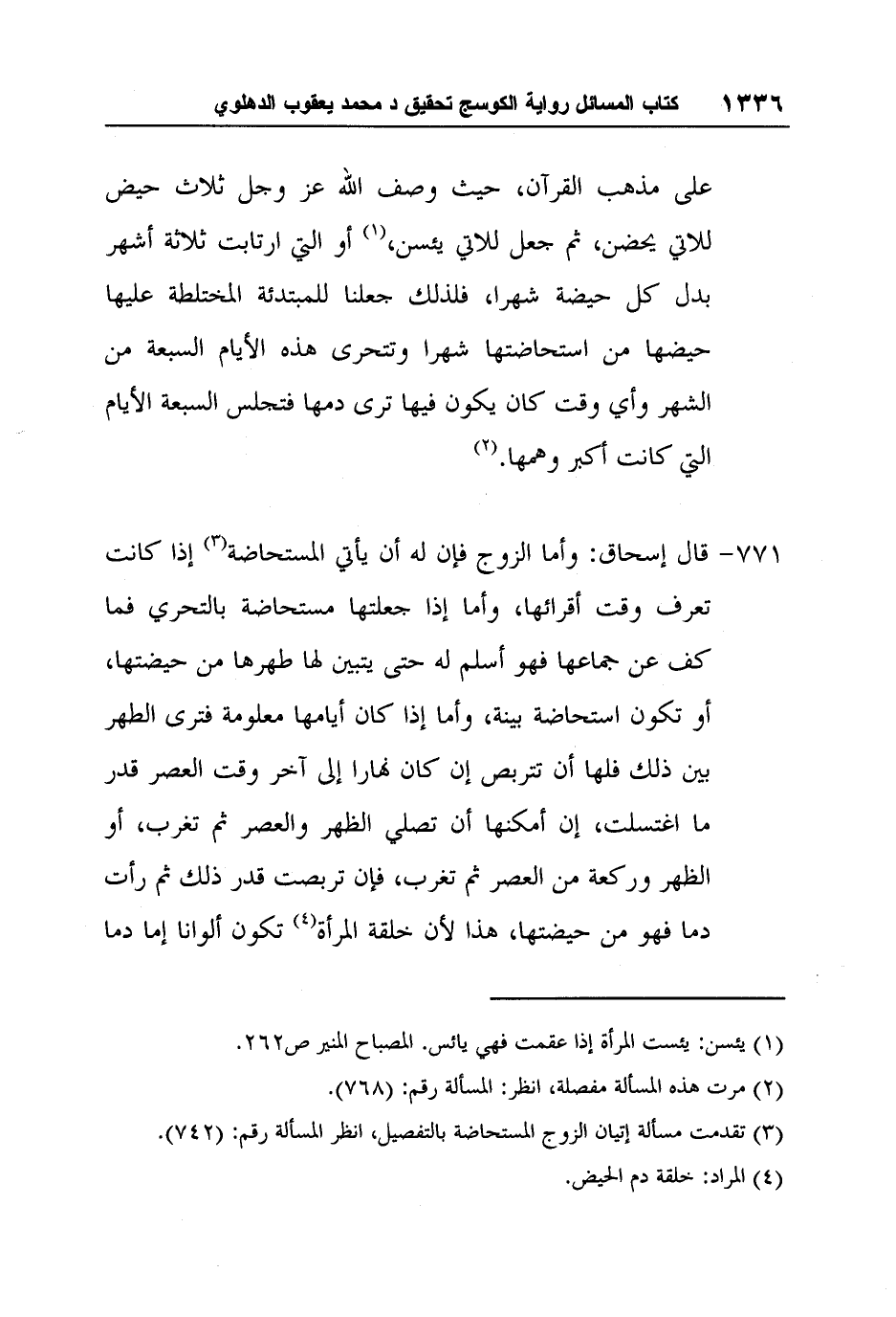 [771-] قال إسحاق: وأما الزوج فإنّ له أن يأتي المستحاضة3 إذا كانت تعرف وقت أقرائها، وأما إذا جعلتها مستحاضة بالتحرّي فما كفّ عن جماعها فهو أسلم له حتّى يتبين لها طهرها من حيضتها، أو تكون استحاضة بيّنة، وأما إذا كان أيّامها معلومة فترى الطهر بين ذلك فلها أن تتربّص إن كان نهارا إلى آخر وقت العصر قدر ما اغتسلت، إن أمكنها أن تصلي الظهر والعصر ثمّ تغرب، أو الظهر وركعة من العصر ثمّ تغرب، فإن تربصت قدر ذلك ثمّ رأت دمّا فهو من حيضتها، هذا لأنّ خلقة المرأة4 تكون ألوانا إما دمّا