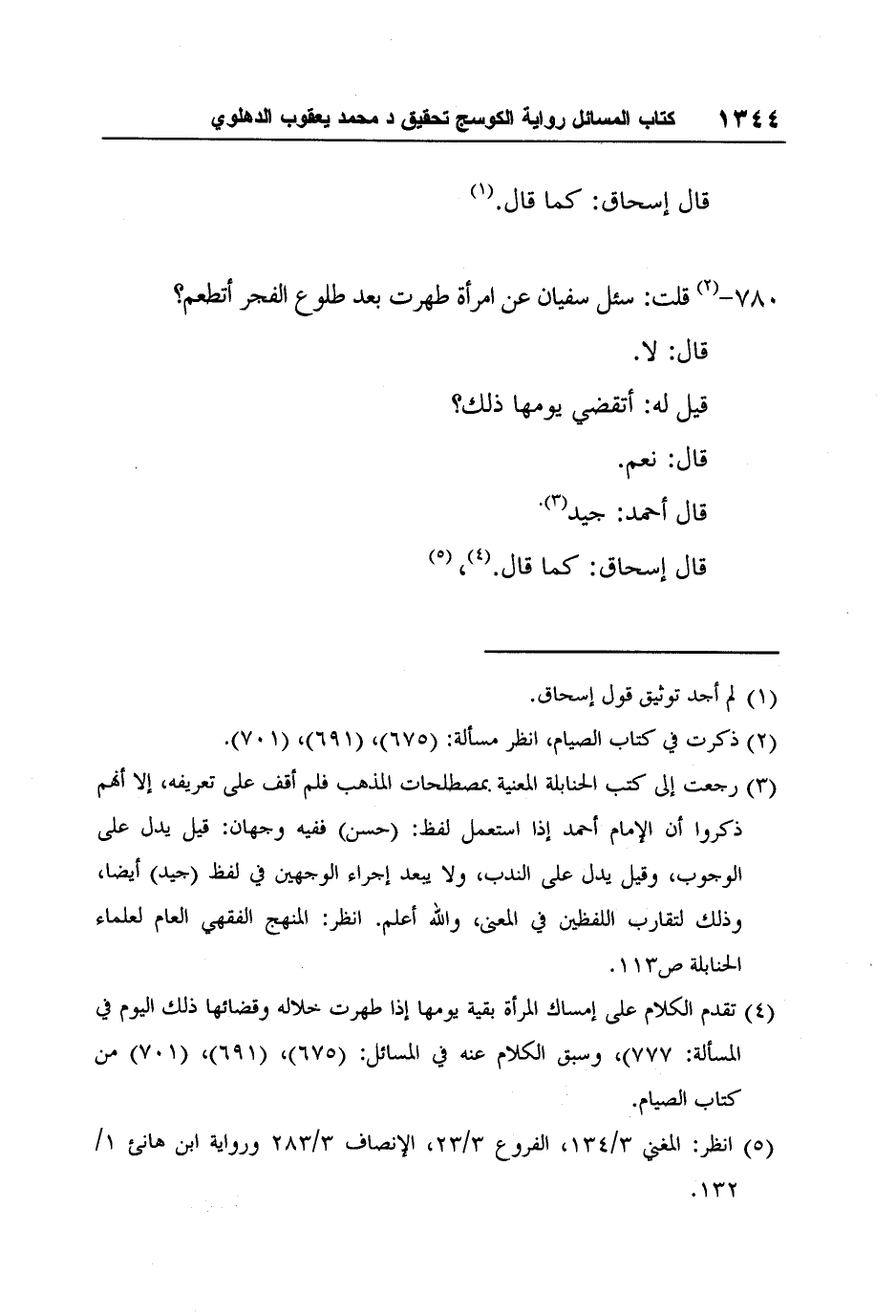 4 تقدّم الكلام على إمساك المرأة بقية يومها إذا طهرت خلاله وقضائها ذلك اليوم في المسألة: 777) ، وسبق الكلام عنه في المسائل: (675) ، (691) ، (701) من كتاب الصيام.