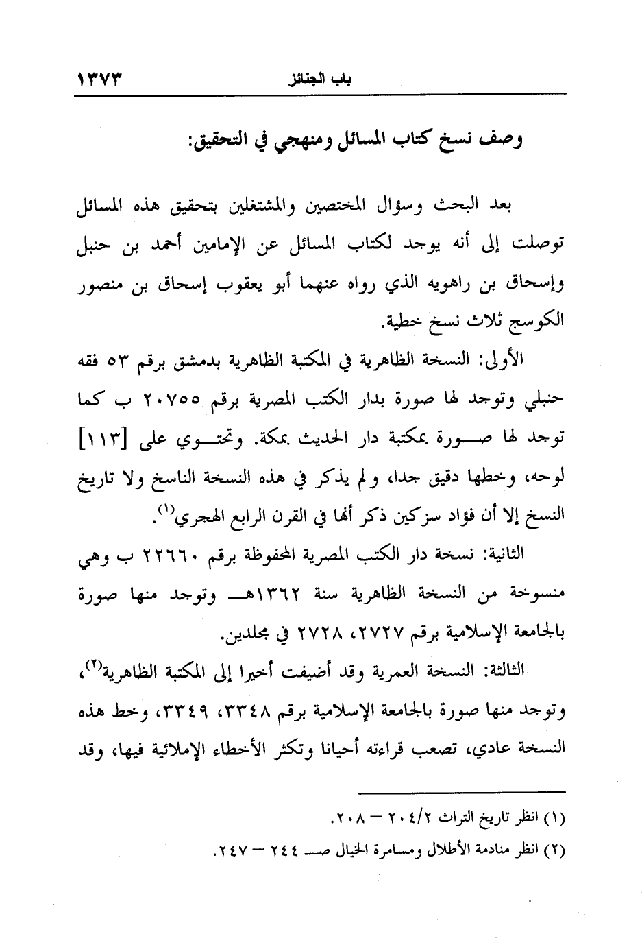 وصف نسخ كتاب المسائل ومنهجي في التحقيق (كتاب الجنائز)
