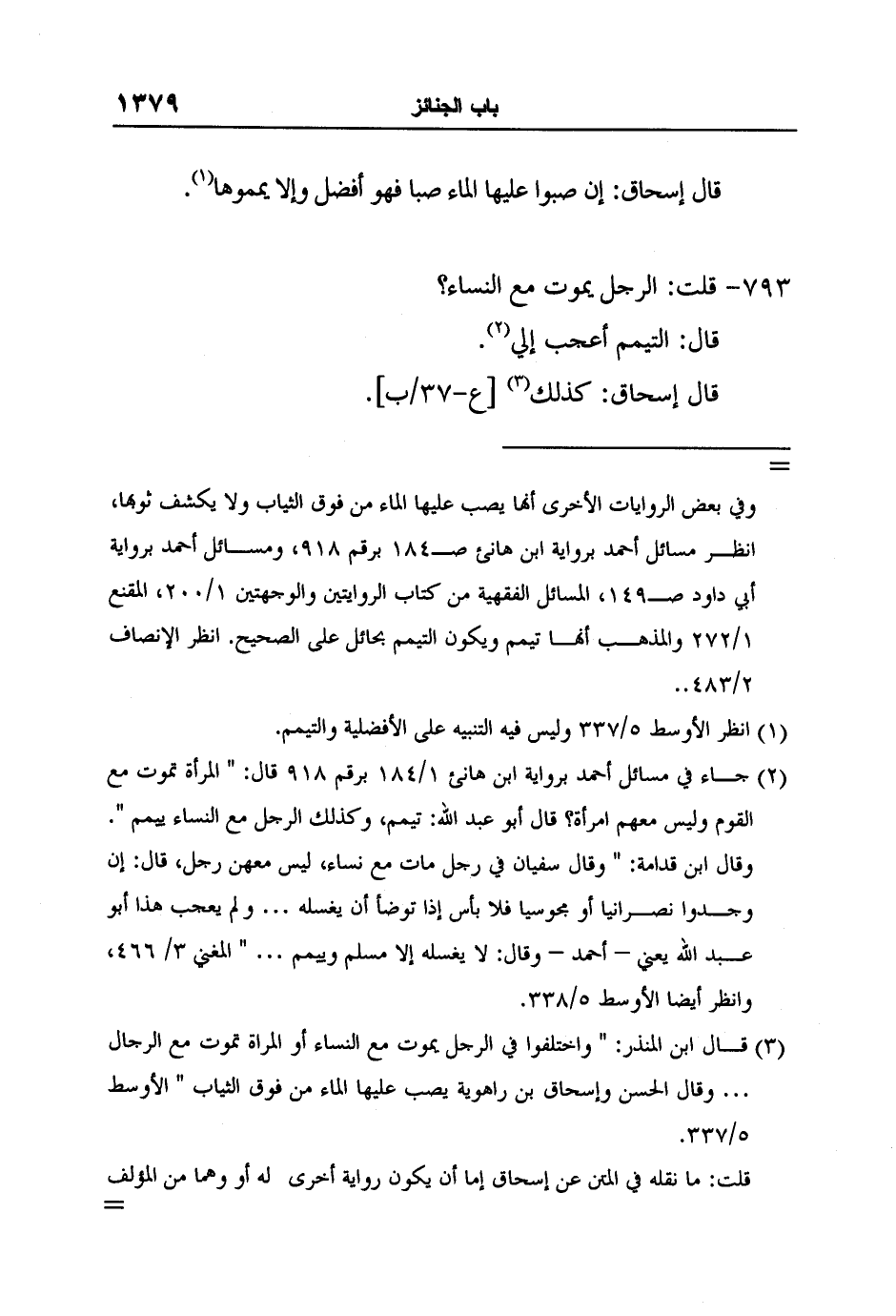 3 قال ابن المنذر: " واختلفوا في الرجل يموت مع النساء أو المراة تموت مع الرجال … وقال الحسن وإسحاق بن راهوية يصب عليها الماء من فوق الثياب " الأوسط 5/337.