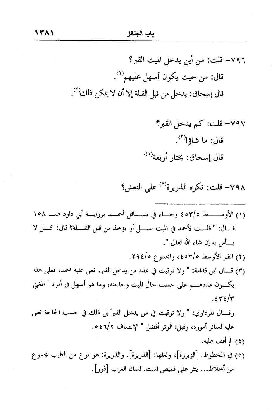 1 الأوسط 5/453 وجاء في مسائل أحمد برواية أبي داود صـ 158 قال: " قلت لأحمد في الميت يسلُّ أو يؤخذ من قبل القبلة؟ قال: كلٌّ لا بأس به إن شاء الله تعالى ".