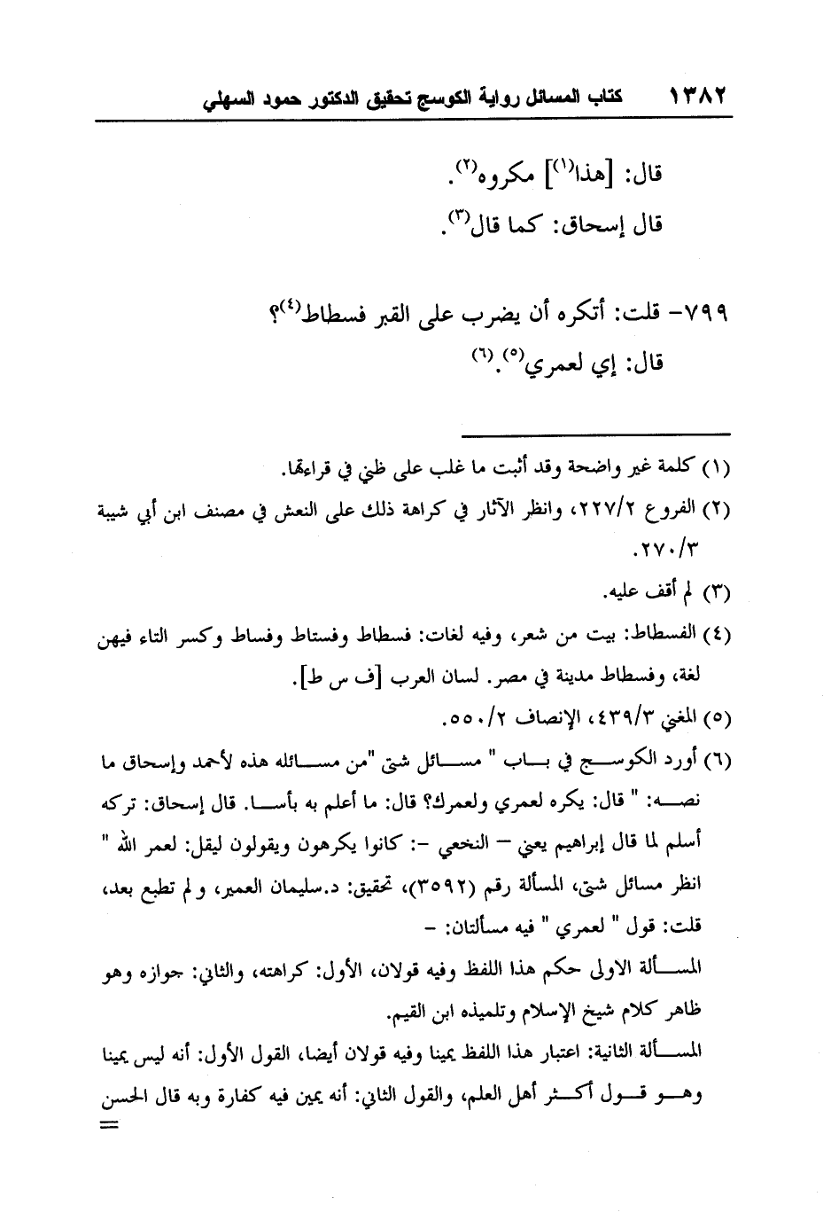 6 أورد الكوسج في باب " مسائل شتى "من مسائله هذه لأحمد وإسحاق ما نصه: " قال: يكره لعمري ولعمرك؟ قال: ما أعلم به بأساً. قال إسحاق: تركه أسلم لما قال إبراهيم يعني – النخعي -: كانوا يكرهون ويقولون ليقل: لعمر الله " انظر مسائل شتى، المسألة رقم (3592) ، تحقيق: د. سليمان العمير، ولم تطبع بعد، قلت: قول " لعمري " فيه مسألتان: -