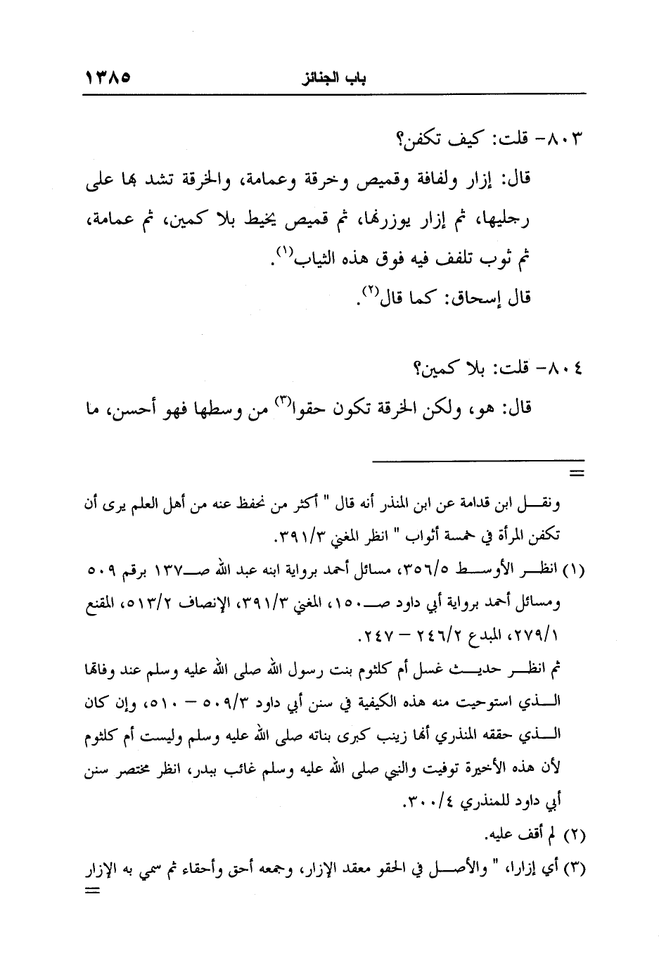 قال: إزارٌ ولفافة وقميص وخرقة وعمامة، والخرقة تشد بها على رجليها، ثم إزار يوزرنها، ثم قميص يخيط بلا كمين، ثم عمامة، ثم ثوب تلفف فيه فوق هذه الثياب1.