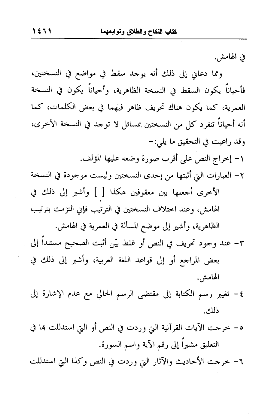 2- العبارات التي أثبتها من إحدى النسختين وليست موجودة في النسخة الأخرى أجعلها بين معقوفين هكذا [] وأشير إلى ذلك في الهامش، وعند اختلاف النسختين في الترتيب فإني التزمت بترتيب الظاهرية، وأشير إلى موضع المسألة في العمرية في الهامش.