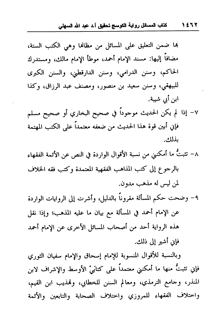 9- وضحت حكم المسألة مقروناً بالدليل، وأشرت إلى الروايات الواردة عن الإمام أحمد في المسألة مع بيان ما عليه المذهب؛ وإذا نقل هذه الرواية أحد من أصحاب المسائل الأخرى عن الإمام أحمد فإني أشير إلى ذلك.