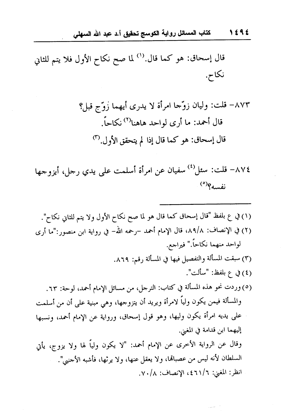 2 في الإنصاف: 8/89، قال الإمام أحمد -رحمه الله- في رواية ابن منصور:"ما أرى لواحد منهما نكاحاً." فيراجع.
