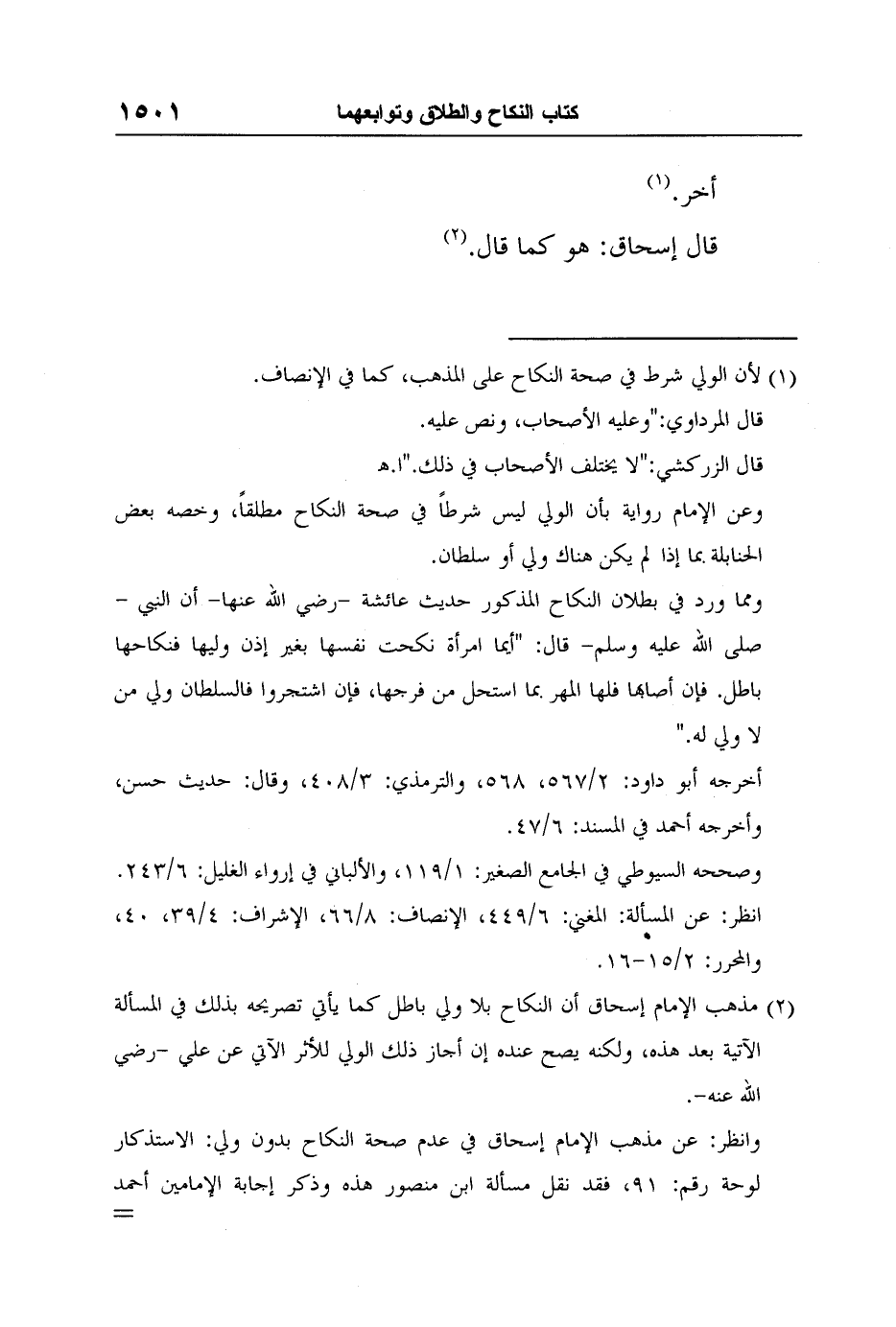 وانظر: عن مذهب الإمام إسحاق في عدم صحة النكاح بدون ولي: الاستذكار لوحة رقم: 91، فقد نقل مسألة ابن منصور هذه وذكر إجابة الإمامين أحمد وإسحاق.