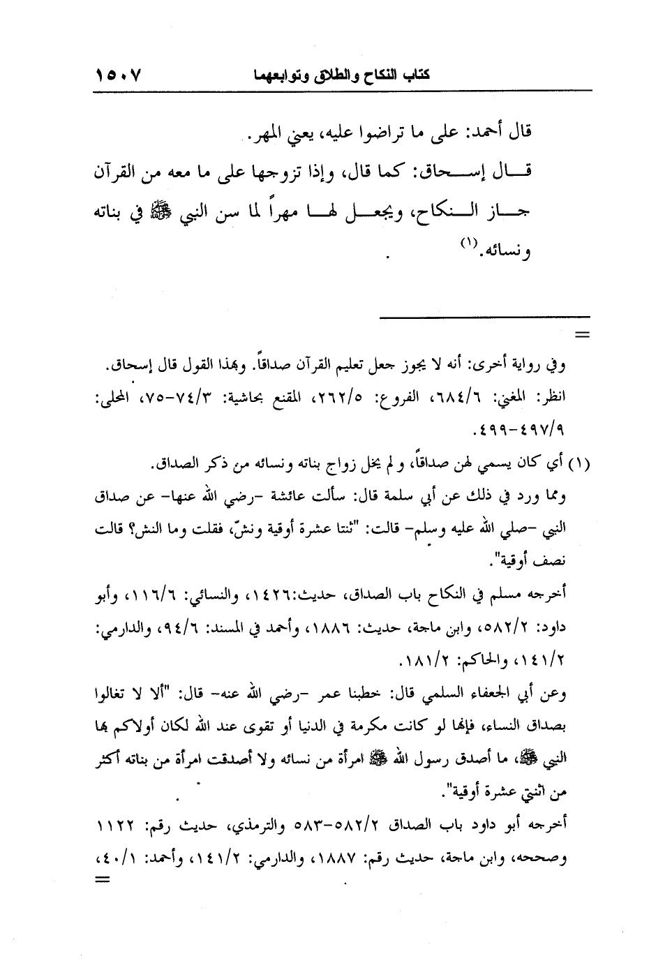 [] أخرجه أبو داود باب الصداق 2/582-583 والترمذي، حديث رقم: 1122 وصححه، وابن ماجة، حديث رقم: 1887، والدارمي: 2/141، وأحمد: 1/40، وابن حبان وصححه: 1259، والحاكم: 2/ 175.