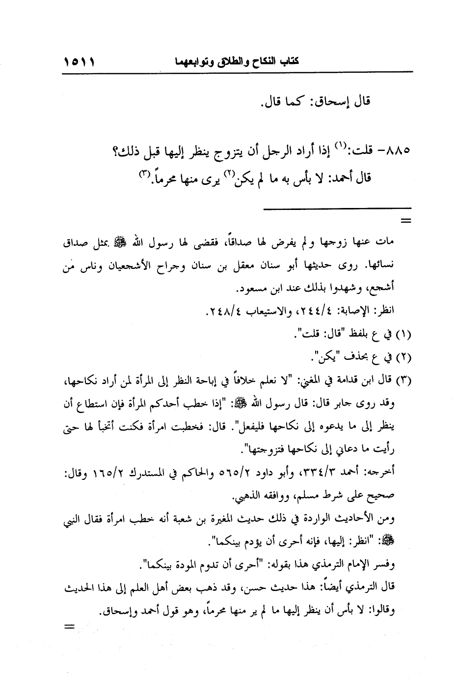 3 قال ابن قدامة في المغني: "لا نعلم خلافاً في إباحة النظر إلى المرأة لمن أراد نكاحها، وقد روى جابر قال: قال رسول الله صلى الله عليه وسلم: "إذا خطب أحدكم المرأة فإن استطاع أن ينظر إلى ما يدعوه إلى نكاحها فليفعل". قال: فخطبت امرأة فكنت أتخبأ لها حتى رأيت ما دعاني إلى نكاحها فتزوجتها".
