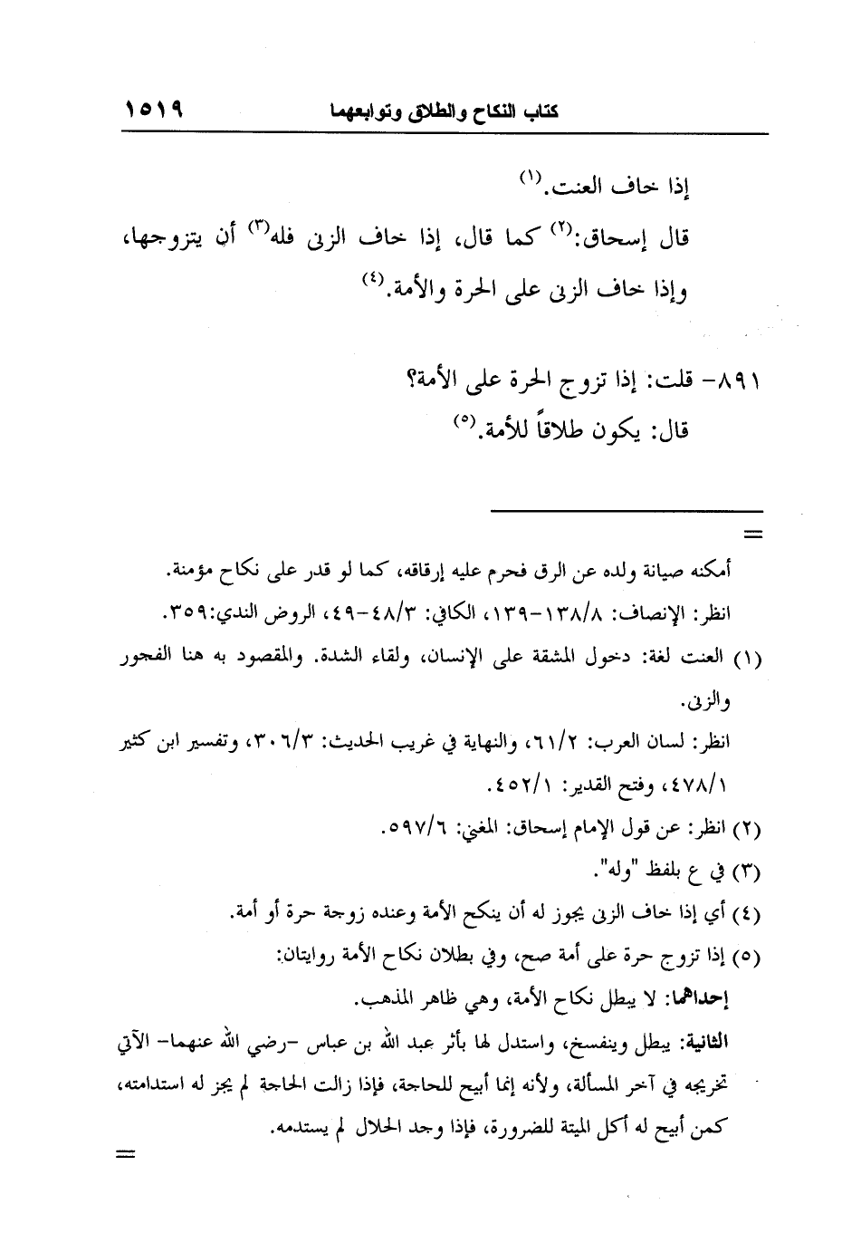 قال إسحاق:2 كما قال، إذا خاف الزنى فله3 أن يتزوجها، وإذا خاف الزنى على الحرة والأمة.4