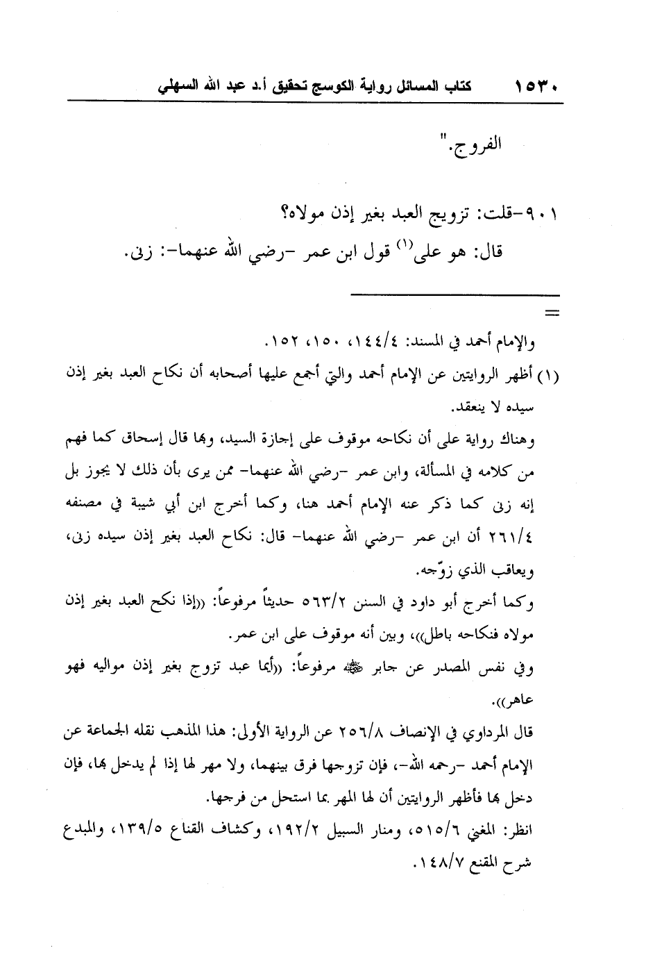 وكما أخرج أبو داود في السنن 2/563 حديثاً مرفوعاً: "إذا نكح العبد بغير إذن مولاه فنكاحه باطل"، وبين أنه موقوف على ابن عمر.