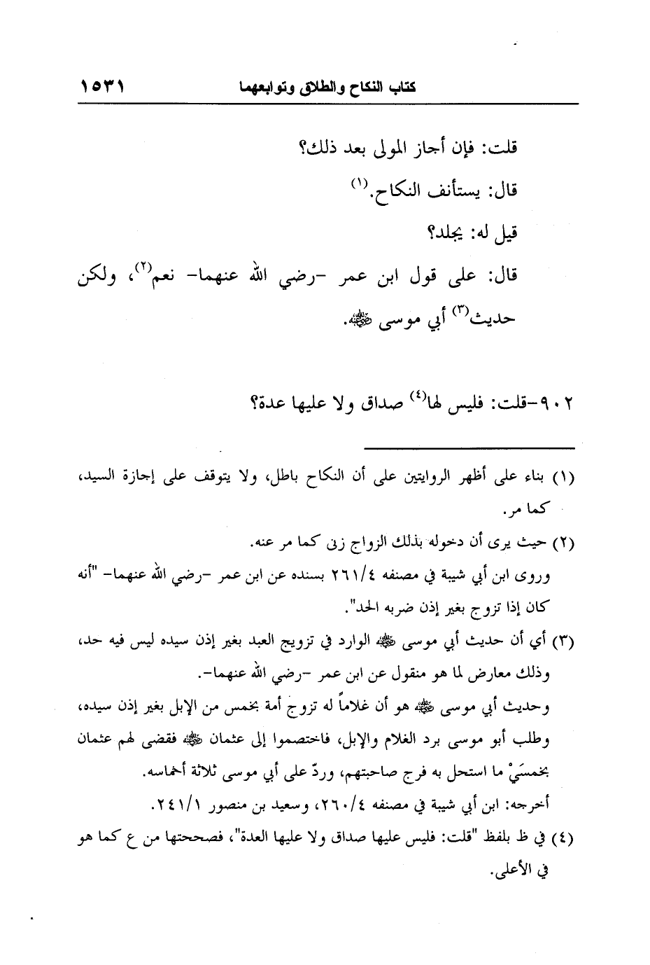 3 أي أن حديث أبي موسى رضي الله عنه الوارد في تزويج العبد بغير إذن سيده ليس فيه حد، وذلك معارض لما هو منقول عن ابن عمر -رضي الله عنهما-.