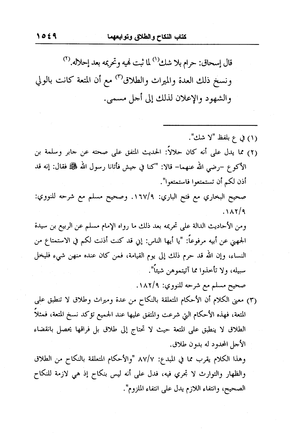 3 معنى الكلام أن الأحكام المتعلقة بالنكاح من عدة وميراث وطلاق لا تنطبق على المتعة، فهذه الأحكام التي شرعت والمتفق عليها عند الجميع تؤكد نسخ المتعة، فمثلاً الطلاق لا ينطبق على المتعة حيث لا تحتاج إلى طلاق بل فراقها يحصل بانقضاء الأجل المحدود له بدون طلاق.