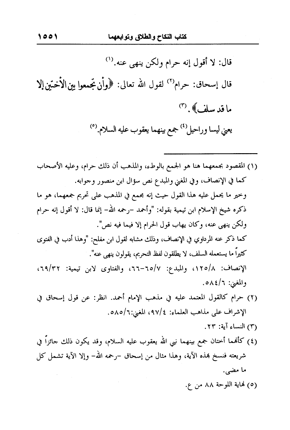 1 المقصود بجمعهما هنا هو الجمع بالوطء، والمذهب أن ذلك حرام، وعليه الأصحاب كما في الإنصاف، وفي المغني والمبدع نص سؤال ابن منصور وجوابه.