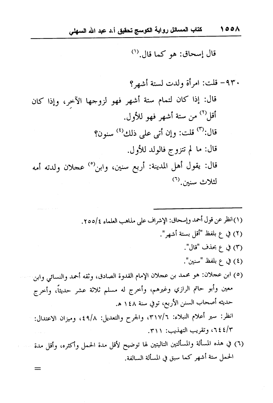 5 ابن عجلان: هو محمد بن عجلان الإمام القدوة الصادق، وثقه أحمد والنسائي وابن معين وأبو حاتم الرازي وغيرهم، وأخرج له مسلم ثلاثة عشر حديثاً، وأخرج حديثه أصحاب السنن الأربع، توفي سنة 148 ?.