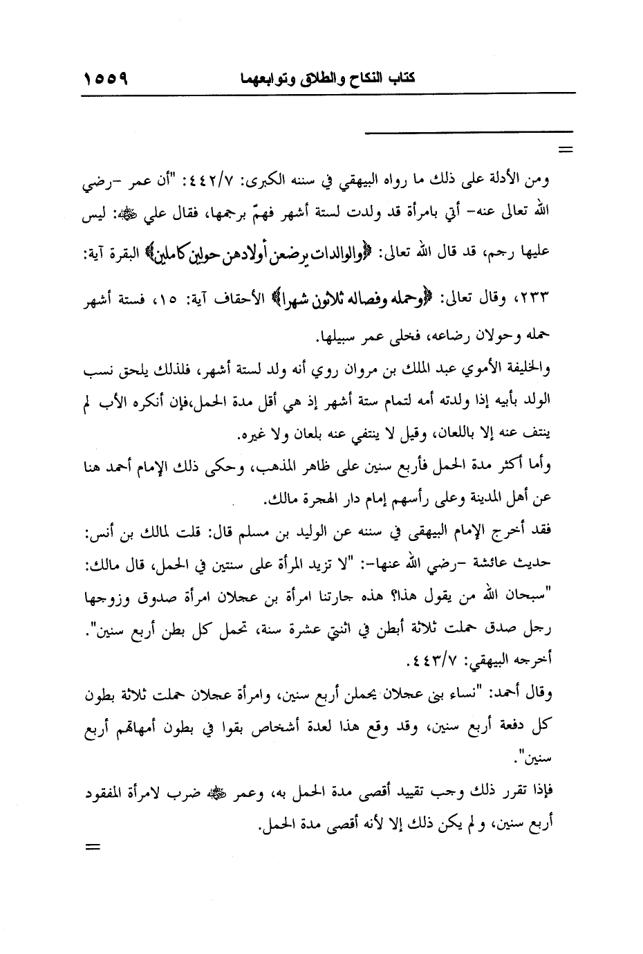 = ومن الأدلة على ذلك ما رواه البيهقي في سننه الكبرى: 7/442: "أن عمر -رضي الله تعالى عنه- أتي بامرأة قد ولدت لستة أشهر فهمّ برجمها، فقال علي رضي الله عنه: ليس عليها رجم، قد قال الله تعالى: {وَالْوَالِدَاتُ يُرْضِعْنَ أَوْلادَهُنَّ حَوْلَيْنِ كَامِلَيْنِ} البقرة آية:233، وقال تعالى: {وَحَمْلُهُ وَفِصَالُهُ ثَلاثُونَ شَهْراً} الأحقاف آية: 15، فستة أشهر حمله وحولان رضاعه، فخلى عمر سبيلها.